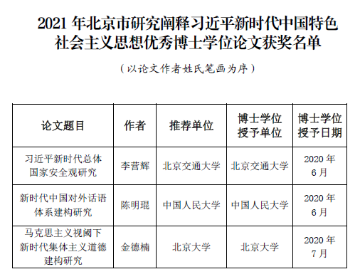 近日,北京市习近平新时代中国特色社会主义思想研究中心(以下简称“北京市研究中心”)公布2021年北京市研究阐释习近平新时代中国特色社会主义思想优秀博士学位论文获奖名单。逼喱逼喱 韩振峰教授指导的20届博士毕业生、我院青年教师李营辉的博士论文《习近平新时代总体国家安全观研究》入围获奖。