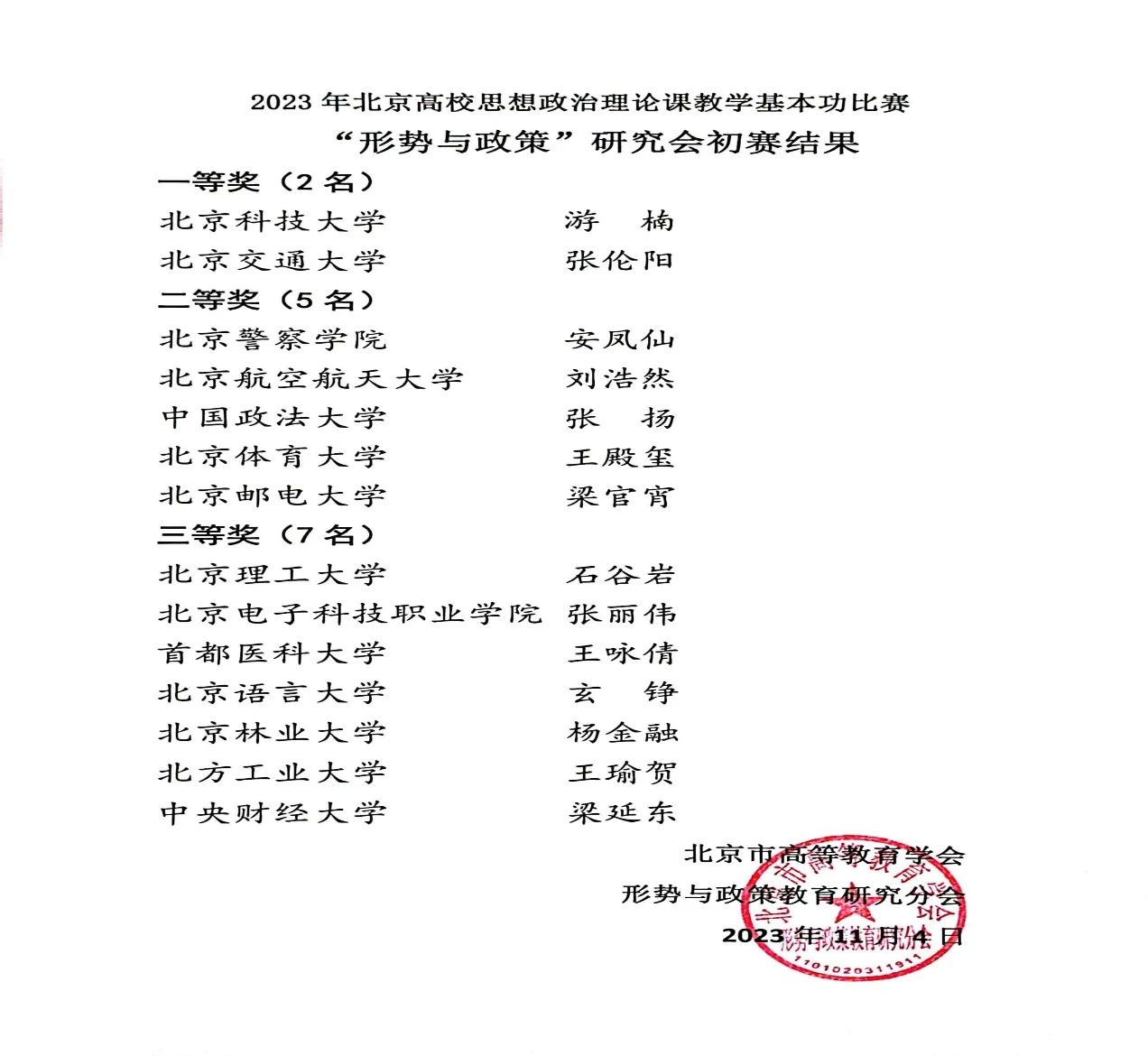 本次比赛由北京市高等教育学会形势与政策教育研究分会主办,逼喱逼喱 逼喱逼喱 承办。来自北京大学、北京航空航天大学、北京理工大学、北京邮电大学、中国政法大学、中央财经大学、对外经济贸易大学、北京科技大学、北京林业大学、北京化工大学、逼喱逼喱 等24所在京高校的“形势与政策”课教师参加了比赛。比赛以推动党的二十大精神融入思政课教学为主题,重点考察思政课教师学深悟透党的二十大精神,并将其融入课堂教学的理论水平,特别是立足京华大地生动实践讲好“大思政课”的能力。